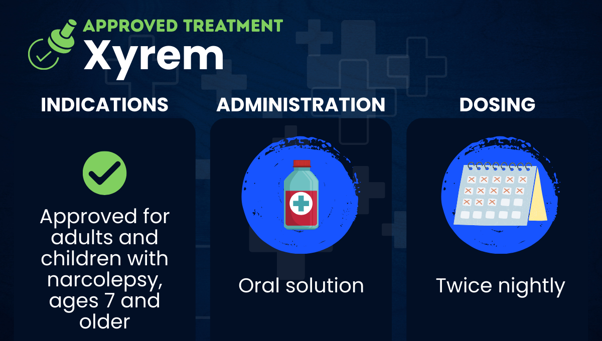 Xyrem (sodium oxybate) is an approved oral therapy that’s used to treat excessive daytime sleepiness (EDS) or cataplexy in adults and children with narcolepsy.
